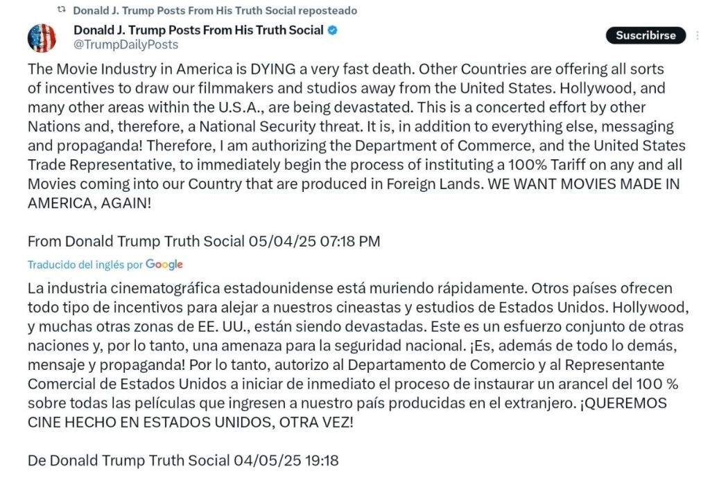 El presidente de los Estados Unidos, Donald J, Trump anunció en su cuenta de X (anteriormente Twitter) que se le impondrá un impuesto del 100% a todas aquellas películas que entren al país y que no hayan sido grabadas dentro del territorio americano, esto según palabras del mandatario «la industria cinematográfica en Estados Unidos está muriendo rápidamente«
